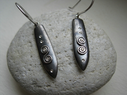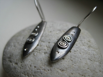 Ez a fülbevalóm az antik csigás kollekcióm tagja. Hozzá tartozik az antik csigás medál, gyűrű és karkötő is. A levél formájú medál alapra egy csiga formára hajlított finom ezüst huzal van forrasztva. A medál alapja egy különleges folyadékkal le van antikolva, hogy jobban kiemelkedjen a tükörfényesre polírozott csigás ezüst huzal.A fülbevaló felületére még pár apró, fényes lyukat fúrtam díszítésnek, hogy érdekesebb legyen.