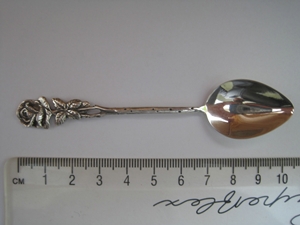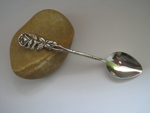 Körülbelül 10 gr 925-ös ezüstből készítettem viaszveszejtéses öntési technikával, a kanál feje préselt ezüst lemezből van.