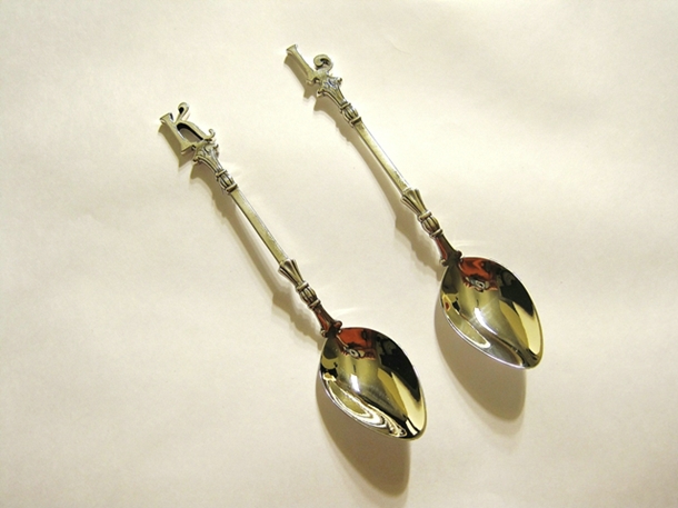 Körülbelül 17 gramm 925-ös sterling ezüstből készültek darabonként. A kanálfej préselt ezüstlemezből van és a szárhoz van forrasztva.