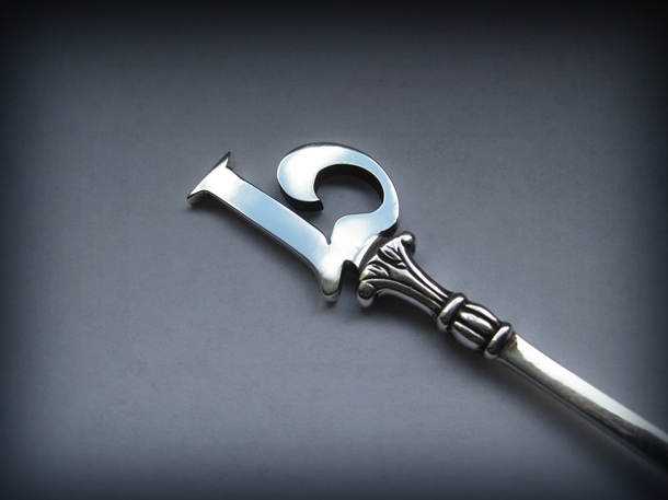 Vastag, masszív, tömör ezüst lapból van a monogram egyedileg kézi munkával kifűrészelve, kireszelgetve, kialakítva.
