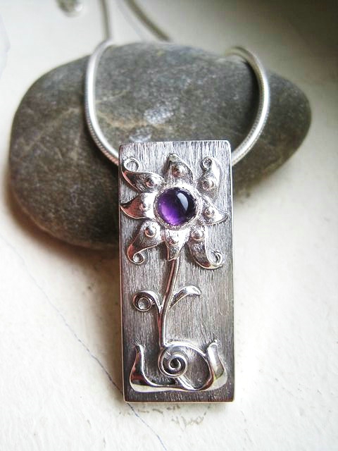 A medál közepébe egy gyönyörű lila, kaboson csiszolású valódi ametisztet foglaltam bele.